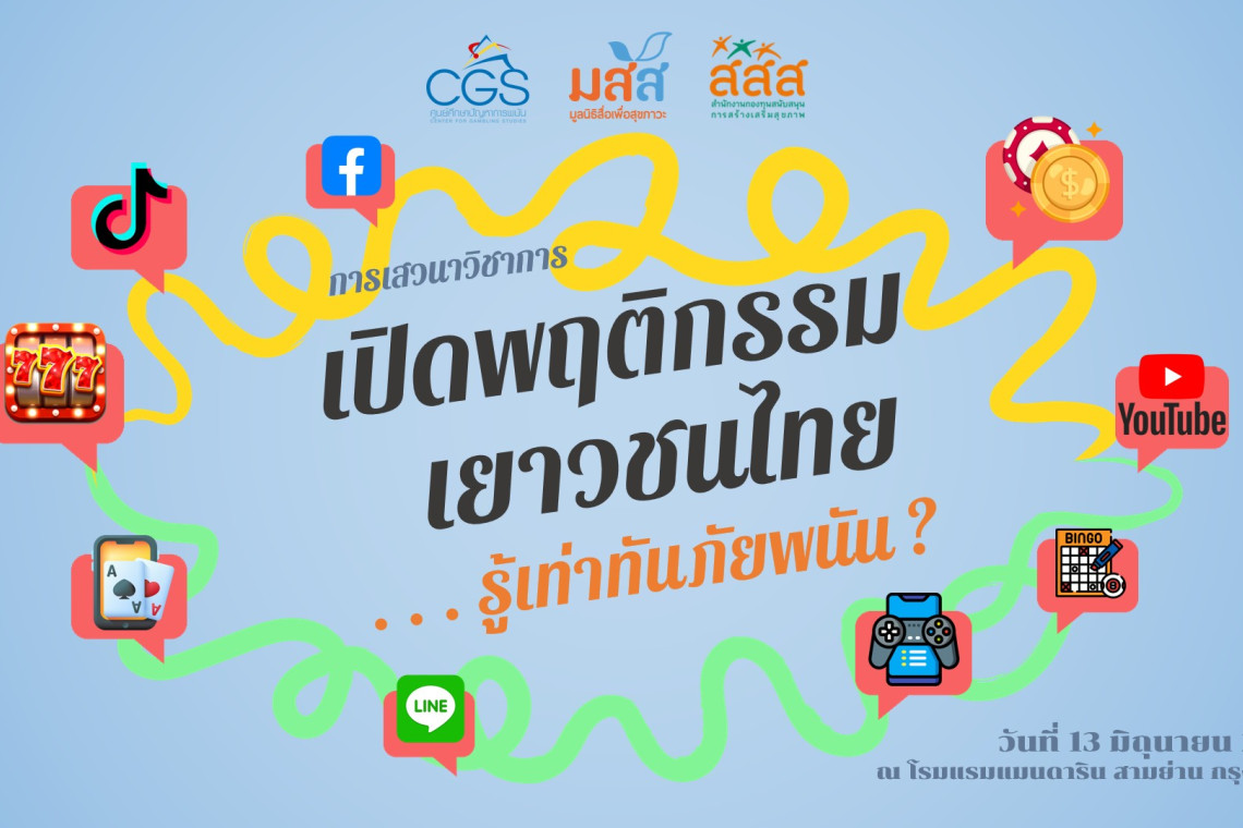 ศูนย์ศึกษาปัญหาการพนัน ร่วมกับมูลนิธิสื่อเพื่อสุขภาวะ (มสส.)โดยการสนับสนุนของสำนักงานกองทุนสนับสนุนการสร้างเสริมสุขภาพ(สสส.)จัดเสวนาวิชาการ นำเสนอ 3 ผลงานวิจัย เรื่อง “เปิดพฤติกรรมเยาวชนไทย...รู้เท่าทันภัยพนัน ?” เมื่อวันอังคารที่ 13 มิถุนายน 2566 ณ โรงแรมแมนดาริน สามย่าน กรุงเทพ โดยมี นายวิเชษฐ์ พิชัยรัตน์ สื่อมวลชนอาวุโส เป็นผู้ดำเนินรายการ
