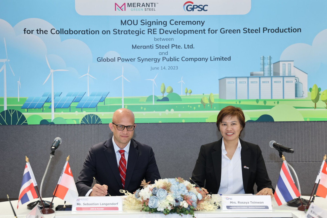 นางรสยา เธียรวรรณ รองกรรมการผู้จัดการใหญ่พัฒนาธุรกิจ บริษัท โกลบอล เพาเวอร์ ซินเนอร์ยี่ จำกัด (มหาชน) หรือ GPSC แกนนำนวัตกรรมธุรกิจไฟฟ้ากลุ่ม ปตท. เปิดเผยว่า วันนี้(14 มิ.ย.) GPSC ได้ร่วมลงนามในบันทึกข้อตกลงความร่วมมือ (MOU) กับ บริษัท มีเรนติ สตีล จำกัด (Meranti Steel Pte. Ltd.) ผู้ผลิตเหล็กชั้นนำของประเทศสิงคโปร์ เพื่อศึกษาความเป็นไปได้ในการพัฒนาโครงการพลังงานสะอาด และระบบบริหารจัดการด้านพลังงานเพื่อใช้ในกระบวนการผลิตเหล็กที่เป็นมิตรกับสิ่งแวดล้อม โดย Meranti มีแผนที่จะเข้ามาตั้งโรงงานผลิตเหล็กคุณภาพสูงในไทย เน้นใช้พลังงานสะอาด ทั้งในกลุ่มพลังงานแสงอาทิตย์ และพลังงานลม โดยคาดว่าจะมีความต้องการในการใช้ไฟฟ้าประมาณ 150 เมกะวัตต์