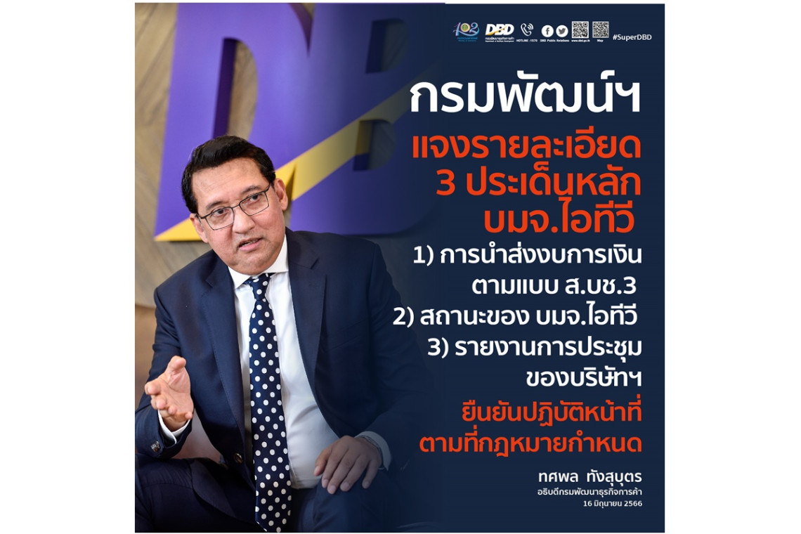 กรมพัฒนาธุรกิจการค้า ชี้แจงรายละเอียดการนำส่งงบการเงิน บริษัท ไอทีวี จำกัด (มหาชน) และข้อสงสัยสาธารณชน 3 ประเด็นหลัก 1.การนำส่งงบการเงินตามแบบ ส.บช.3 2.สถานะของ บมจ.ไอทีวี 3.รายงานการประชุมของบริษัท ทั้งนี้ กรมฯ ยืนยันว่าปฏิบัติหน้าที่เป็นไปตามที่กฎหมายกำหนด