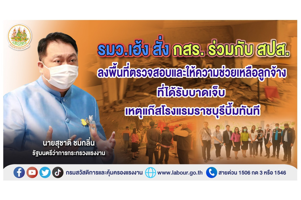 รมว.สุชาติ ห่วงใยลูกจ้าง 4 ราย เหตุถังแก๊สโรงแรมแห่งหนึ่งในจังหวัดราชบุรีระเบิด สั่งกรมสวัสดิการและคุ้มครองแรงงาน (กสร.) และสำนักงานประกันสังคม (สปส.) ลงพื้นที่หาสาเหตุ พร้อมเร่งช่วยเหลือสิทธิประโยชน์แก่ลูกจ้างบาดเจ็บ เน้นย้ำนายจ้างปฏิบัติตามกฎหมายความปลอดภัยเพื่อป้องกันเหตุ