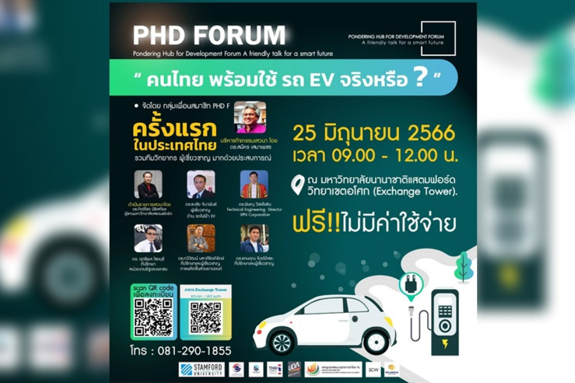กลุ่มเพื่อนสมาชิก PHD.F ขอเชิญชวนนักศึกษาและบุคคลทั่วไปที่สนใจ เข้าร่วมกิจกรรม : แคมปัส ออนทัวร์ ครั้งที่ 1 งานเสวนา PHD Forum “คนไทย พร้อมใช้ รถ EV จริงหรือ?” โดยวิทยากรผู้เชี่ยวชาญมากด้วยประสบการณ์ ได้แก่ 1. ดร.ธงชัย จินาพันธ์ ผู้เชี่ยวชาญด้านรถไฟฟ้า EV 2. ดร.พิษณุ วิชยโยธิน Technical Engineering Director บจก. SPN Corporation 3. ดร.ฤทธิพล ไชยบุรี ที่ปรึกษาหน่วยงานรัฐและเอกชน 4. ดร.ทวีวัฒน์ มหาศิริอภิรักษ์ ที่ปรึกษา ผู้เชี่ยวชาญการผลิตชิ้นส่วนยานยนต์ 5. ดร.กิตติโชค นิธิเสถียร ผู้แทน มหาวิทยาลัยแสตมฟอร์ด 6. ดร.แทนคุณ จิตต์อิสระ ในวันอาทิตย์ที่ 25 มิถุนายน 2566 เวลา 09.00 – 13.00 น. ณ อาคาร Exchange Tower ชั้น G มหาวิทยาลัยนานาชาติแสตมฟอร์ด วิทยาเขตอโศก กรุงเทพฯ สำหรับผู้สนใจสามารถลงทะเบียนเข้าร่วมฟรี!! ไม่มีค่าใช้จ่าย พร้อมรับของที่ระลึกทุกท่าน ได้ที่โทรศัพท์ 081-290-1810 หรือลงทะเบียนสแกนคิวอาร์โค้ดได้ที่รูป