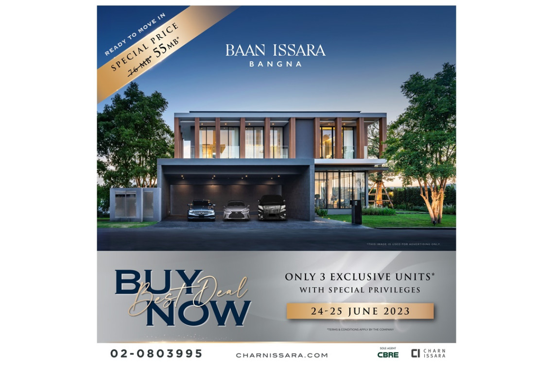 โครงการบ้านอิสสระ บางนา (Baan Issara Bangna) บ้านเดี่ยวระดับซูเปอร์ลักชัวรี่จัดโปรโมชั่นดีลเด็ดโดนใจ Buy Now Best Deal กับ 3 ยูนิตพิเศษ ซื้อวันนี้ รับดีลดีสุด ในราคาเริ่มต้นเพียง 55 ล้านบาท* (จากราคาปกติ 76 ล้านบาท) พร้อม Special Privilege* อีกมากมาย ให้ลูกค้าได้มาร่วมสัมผัสนิยาม Super Luxury ภายใต้ แรงบันดาลใจสไตล์ Modern Tropical ที่สะท้อนความเรียบหรู ของการใช้ชีวิตที่อิสสระ พิเศษเฉพาะ วันที่ 24-25 มิถุนายน 2566 ณ โครงการ บ้านอิสสระ บางนา