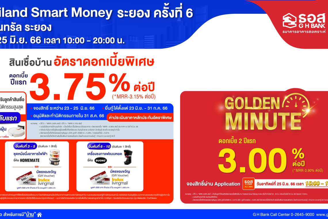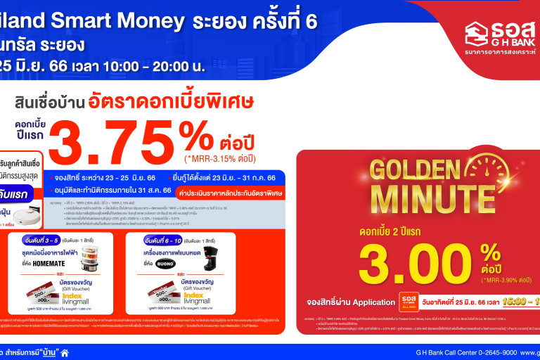 สำหรับผู้ที่จองสิทธิ์สินเชื่อ ต่อที่ 1 ในระยะเวลาที่กำหนด สามารถจองสิทธิ์อัตราดอกเบี้ยต่ำสุดๆ 2 ปีแรก MRR-3.90% ต่อปี (เท่ากับ 3.00% ต่อปี) เท่านั้น เพียงจองสิทธิ์ผ่าน Mobile Application : GHB ALL GEN ในวันอาทิตย์ที่ 25 มิถุนายน 2566 ระหว่างเวลา 15.00-15.15 น. จองก่อนได้ก่อน กรอบวงเงินจำกัด โดยลูกค้าสามารถยื่นคำขอกู้ภายในวันที่ 23 มิถุนายน - 31 กรกฎาคม 2566 และทำนิติกรรมได้ภายในวันที่ 31 สิงหาคม 2566 3. สลากออมทรัพย์ ธอส. ให้ผลตอบแทนดี มีโอกาสถูกรางวัลสูง นำโดย ชุดพิมานมาศ Plus Phase 2 หน่วยละ 50,000 บาท ผลตอบแทนหน้าสลาก 1.25% ต่อปี และโอกาสลุ้นรางวัลที่ 1 มูลค่ารางวัลละ 3 ล้านบาท ชุดเกล็ดดาว พลัส หน่วยละ 5,000 บาท ผลตอบแทนหน้าสลาก 0.65% ต่อปี พร้อมโอกาสลุ้นรางวัลที่ 1 มูลค่ารางวัลละ 1 ล้านบาท พิเศษ!! สำหรับลูกค้าที่จองสิทธิ์ และ ซื้อสลากออมทรัพย์ ธอส. จำนวนเงิน ตั้งแต่ 1,500,000 บาท ขึ้นไป ต่อรายการ ระหว่างวันที่ 23 มิถุนายน – 2 กรกฎาคม 2566 จะได้รับบัตร Starbucks มูลค่า 150 บาท ท่านละ 1 ใบ ต่อผลิตภัณฑ์ หรือจนกว่าของสมนาคุณจะหมด 4. บ้านมือสอง ธอส. คัดทรัพย์คุณภาพดี ทำเลเด่น หลากหลายประเภท ทั้งบ้านเดี่ยว บ้านแฝด ทาวเฮ้าส์ ห้องชุด อาคารพาณิชย์ และที่ดินเปล่า ในภาคตะวันออกมาจำหน่ายกว่า 2,000 รายการ ส่วนลดสูงสุดถึง 40% ของราคาประเมิน วางเงินประกันซื้อทรัพย์เพียง 5,000 บาท โดยทรัพย์ที่มีราคาขายต่ำสุดเพียง 175,000 บาท ได้แก่ ทรัพย์ประเภทห้องชุด ขนาดพื้นที่ 29.25 ตารางเมตร ในโครงการน้ำทะเลคอนโดมิเนียม อ.เมือง จ.ชลบุรี ขณะที่ทรัพย์เด่นทำเลดีที่น่าสนใจ ได้แก่ ทรัพย์ประเภททาวน์เฮ้าส์ 2 ชั้น ขนาดเนื้อที่ 27.9 ตารางวา ในโครงการโชคมารวย อ.เมือง จ.ระยอง ราคาขายเพียง 890,000 บาท พิเศษ!! รับสิทธิ์สินเชื่ออัตราดอกเบี้ยต่ำสุด นานสูงสุดถึง 24 เดือนอีกด้วย สอบถามรายละเอียดเพิ่มเติมได้ที่ ธอส. ทุกสาขาทั่วประเทศ G H Bank Call Center โทร 0-2645-9000 หรือ Facebook Fanpage ธนาคารอาคารสงเคราะห์