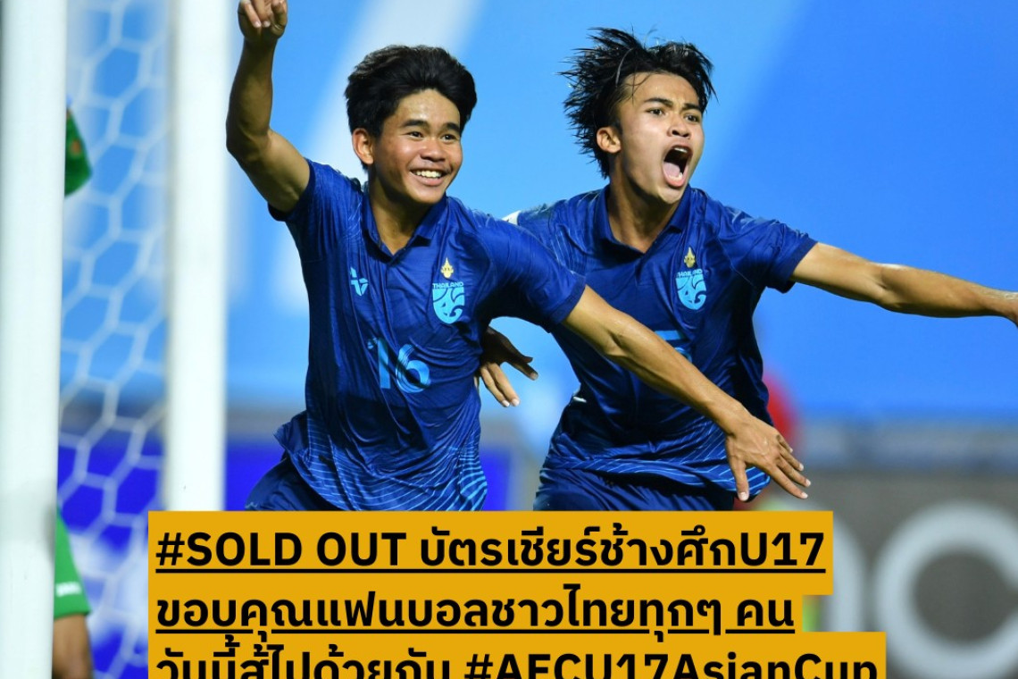 ร่วมใจเชียร์จากแฟนบอลชาวไทยทุกๆ ท่าน ที่ซื้อบัตรเข้าชมการแข่งขันโซนทีมชาติไทย จนหมดแล้วทุกที่นั่ง เพื่อเข้ามาให้กำลังใจน้องๆ นักเตะทีมชาติไทย รุ่นอายุไม่เกิน 17 ปี ทำศึกนัดสำคัญเพื่อลุ้นโควตาไปฟุตบอลเยาวชนโลก พบกับ ทีมชาติเกาหลีใต้ รุ่นอายุไมาเกิน 17 ปี ในวันนี้ เวลา 21.00 น. ถึงขอบสนามปทุมธานี สเตเดียม และสามารถชมถ่ายทอดสดทาง True ID โดยเกมนี้หากทีมชาติไทย U17 เอาชนะได้ ก็จะได้สิทธิ์ไปเล่นฟุตบอลเยาวชนโลกทันที ที่ประเทศอินโดนีเซีย