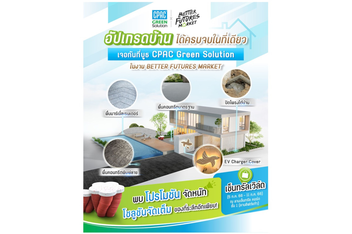 “ซีแพค กรีน โซลูชัน” ผู้นำด้านนวัตกรรมก่อสร้างเพื่อสิ่งแวดล้อม เตรียมเสิร์ฟนวัตกรรมให้เหล่า ‘คนรักบ้าน’ ได้ ‘รักษ์โลก’ แบบครบโซลูชันในงาน “BETTER FUTURES MARKET 2023” มาร์เก็ตที่รวบรวมสินค้าและโซลูชันเพื่อยกระดับที่อยู่อาศัยและตอบโจทย์ไลฟ์สไตล์สายกรีน ณ ศูนย์การค้าเซ็นทรัลพลาซ่าทั้ง 4 สาขา เริ่มที่แรก ณ ลานเซ็นทรัล คอร์ด ชั้น 1 (ลานลิฟต์แก้ว) ระหว่างวันพุธที่ 5 กรกฎาคม – วันอังคารที่ 11 กรกฎาคม 2566