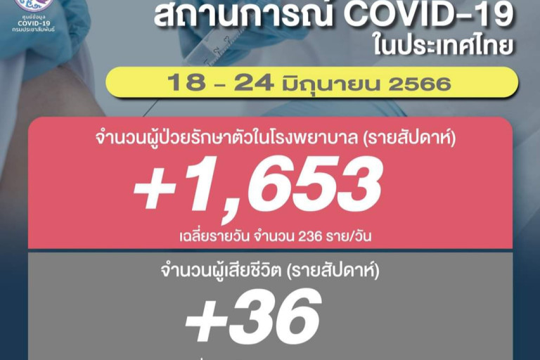 วันที่ 26 มิ.ย.2566 ศูนย์ข้อมูล COVID-19 กรมประชาสัมพันธ์ รายงานสถานการณ์โรคโควิด-19 รายสัปดาห์ เกาะติดยอดผู้ติดเชื้อโควิด-19 รายสัปดาห์ ระหว่างวันที่ 18 - 24 มิถุนายน 2566 พบผู้ป่วยรักษาตัวในโรงพยาบาล (รายสัปดาห์) จำนวน 1,653 ราย : เฉลี่ยรายวัน จำนวน 236 ราย/วัน ผู้เสียชีวิต (รายสัปดาห์) จำนวน 36 ราย : เฉลี่ยรายวัน จำนวน 5 ราย/วัน ทั้งนี้พบยอดป่วยสะสม 27,645 ราย (ตั้งแต่ 1 มกราคม 2566)เสียชีวิตสะสม 659 ราย (ตั้งแต่ 1 มกราคม 2566)