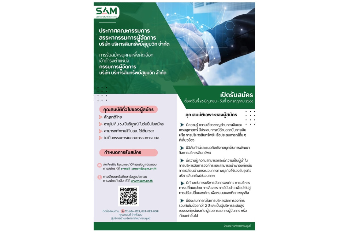 บริษัท บริหารสินทรัพย์สุขุมวิท จำกัด (บสส.) หรือ SAM ประกาศรับสมัครบุคคลเพื่อดำรงตำแหน่งกรรมการผู้จัดการ เพื่อร่วมเป็นส่วนสำคัญในภารกิจบริหารสินทรัพย์ด้อยคุณภาพและขับเคลื่อนเศรษฐกิจของประเทศ ตั้งแต่บัดนี้ ถึง 16 กรกฎาคม 2566 ผู้สนใจสามารถติดต่อสอบถามรายละเอียดการรับสมัคร รวมทั้งส่ง Profile Resume หรือ CV และข้อมูลประกอบการสมัครได้ที่ Email : Arnon@sam.ot.th (นายอานนท์ ดำหริชอบ) ผู้บริหารฝ่ายบริหารทรัพยากรมนุษย์ บริษัท บริหารสินทรัพย์สุขุมวิท จำกัด โทรศัพท์ 02-686-1829 หรือ 063-023-0641 โดยดาวน์โหลดหรือศึกษาข้อมูลประกอบการสมัครคัดเลือกได้ที่ www.sam.or.th หรือ คลิก https://bit.ly/431wuxn