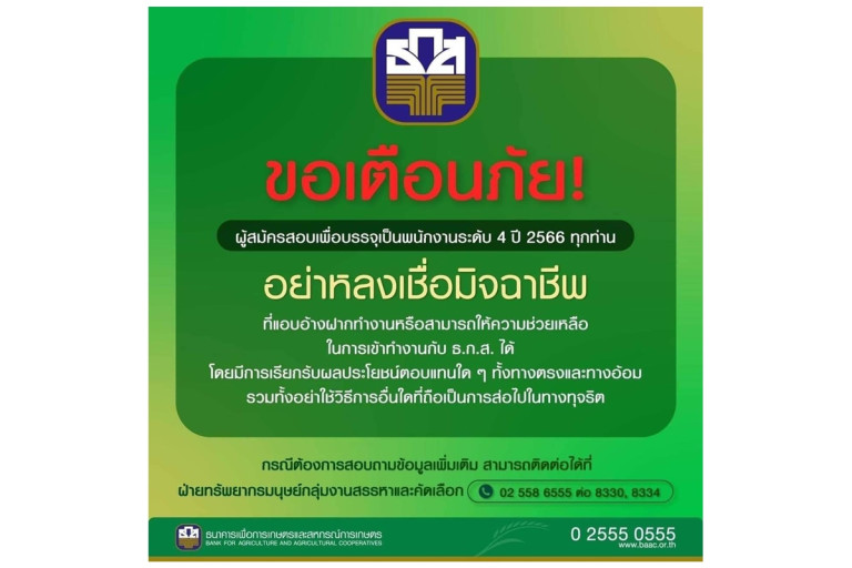 ธ.ก.ส.แจ้งเตือนผู้สมัครสอบเพื่อเป็นพนักงาน ปี 2566 ทุกท่าน อย่าหลงเชื่อมิจฉาชีพแอบอ้างเป็นผู้มีอำนาจหรือมีความสามารถฝากเข้าทำงาน ธ.ก.ส. ได้ และมีการเรียกรับผลประโยชน์ตอบแทนทั้งทางตรงและทางอ้อม ธ.ก.ส. ยืนยันไม่มีส่วนเกี่ยวข้อง และพร้อมดําเนินการเอาผิดตามขั้นตอนทางกฎหมายกับผู้ที่หลอกลวงต่อไป