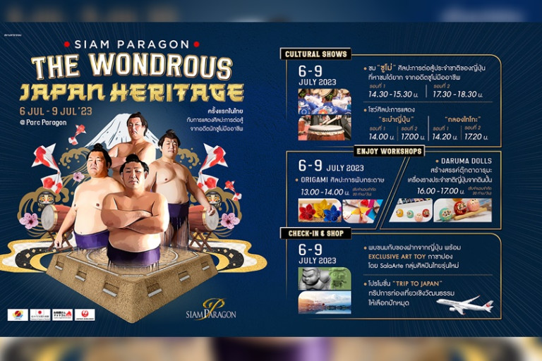 สยามพารากอน ตอกย้ำความเป็นโกลบอลเดสติเนชั่น จุดหมายปลายทางที่ทั้งคนไทยและนักท่องเที่ยวจากทั่วโลกยกให้เป็นหมุดหมายอันดับหนึ่งในใจที่ต้องมาเยือน และยังเป็นเวทีระดับโลกที่นำเสนอสุดยอดประสบการณ์เหนือความคาดหมาย ร่วมกับ สถานเอกอัครราชทูตญี่ปุ่นประจำประเทศไทย, Sumo Experience สำนักสืบทอดและเผยแพร่วัฒนธรรมซูโม่จากญี่ปุ่น และ Japan Airlines สายการบินแห่งชาติญี่ปุ่น ร่วมฉลองครบรอบ 136 ปี ความสัมพันธ์ทางการทูต อันแน่นแฟ้นระหว่างไทยและญี่ปุ่น ชวนสัมผัสจิตวิญญาณอันทรงพลังของซูโม่ กีฬาประจำชาติญี่ปุ่นที่สืบทอดมายาวนานกว่า 2,000 ปี กับการแสดงแข่งขันซูโม่ส่งตรงจากแดนอาทิตย์อุทัย ครั้งแรกในประเทศไทย นับเป็นโอกาสพิเศษที่หาชมได้ยาก ในงาน “Siam Paragon The Wondrous Japan Heritage” โดยเปิดให้ชมฟรี ระหว่างวันที่ 6-9 กรกฎาคม 2566 ณ พาร์ค พารากอน สยามพารากอน