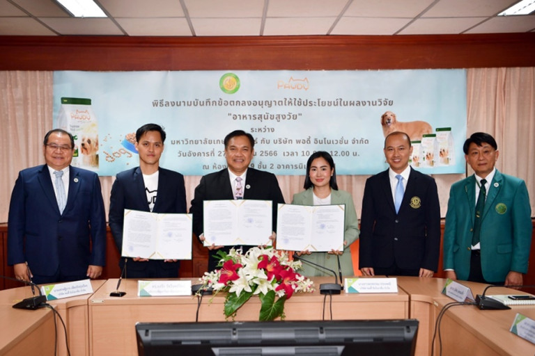 ดร.จงรัก วัชรินทร์รัตน์ อธิการบดีมหาวิทยาลัยเกษตรศาสตร์ ได้ร่วมลงนามบันทึกข้อตกลงอนุญาตให้บริษัท พอดี้ อินโนเวชั่น จำกัด โดยน.ส.พรพรรณ ประเพณี ใช้สิทธิ์ในผลงานวิจัย “อาหารสุนัขสูงวัย” พร้อมด้วย อ.น.สพ.ดร.ณัฐพงศ์ อัคริมาจิรโชติ ร่วมลงนาม โดยมี ผศ.ดร.นิคม แหลมสัก รองอธิการบดีฝ่ายนวัตกรรมและกิจการเพื่อสังคม และ ผศ.ดร.กฤษณ์ วันอินทร์ ผู้ช่วยอธิการบดีฝ่ายนวัตกรรมและกิจการเพื่อสังคม ร่วมในพิธี เมื่อวันที่ 27 มิ.ย.66 ที่ผ่านมา ณ อาคารสารนิเทศ 50 ปี มหาวิทยาลัยเกษตรศาสตร์