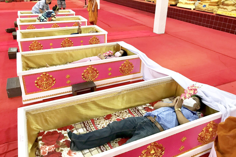 หลังจากกราบไหว้ หลวงพ่อปากแดงแล้ว อีกจุดนึงที่นักท่องเที่ยวให้ความสนใจ คือการสะเดาะเคราะห์นอนโลงศพ สืบชะตาแก้ดวงตก เสริมดวง เจ็บป่วยก็บรรเทาหายไปตามความเชื่อของแต่ละบุคคล โดยให้บุคคลผู้ที่ต้องการทำพิธีลงไปนอนหงายในโลงศพ พร้อมประนมมือหันศีรษะไปทางทิศตะวันตกในลักษณะคล้ายคนตาย จากนั้นพระสงฆ์จะใช้ผ้าขาวที่เปรียบเสมือนเป็นผ้าคลุมศพมาคลุมไปที่โลงศพ และสวดบังสุกุลตาย บังสุกุลเป็น ผู้ที่นอนในโลงก็จะอธิษฐานจิตนึกถึงสิ่งที่ดีงาม และแผ่ส่วนบุญกุศลให้เจ้ากรรมนายเวร การประกอบพิธีจึงเปรียบเสมือนการฝึกตายก่อนตายจริงตามความเชื่อ และเป็นการสืบชะตา เสริมมงคลและส่งผลให้ชีวิตนั้นดีขึ้น ตามความเชื่อของแต่ละบุคคล ซึ่งทางวัดได้จัดพิธีสะเดาะเคราะห์นอนโลงทุกวัน