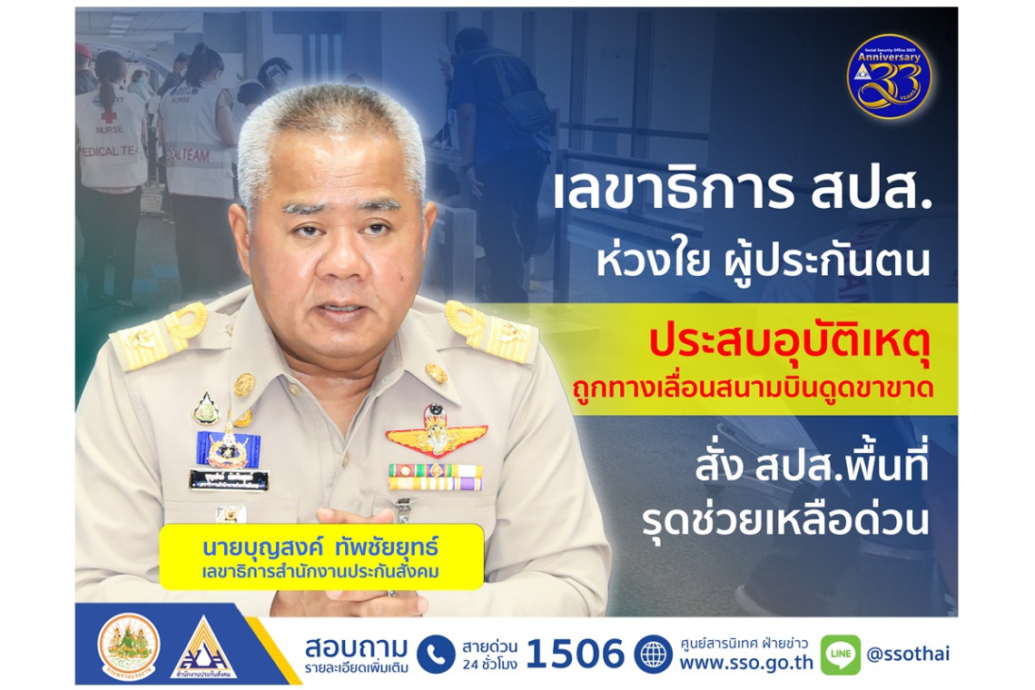 ตามที่ผู้โดยสารประสบเหตุถูกทางเลื่อนท่าอากาศยานดอนเมือง ดูดเท้าและขาข้างซ้ายขาด เมื่อวันที่ 29 มิ.ย.66 เวลา 8.30 น. บันไดเลื่อนดอนเมืองนายบุญสงค์ ทัพชัยยุทธ์ เลขาธิการสำนักงานประกันสังคม มีความห่วงใย พร้อมสั่งการด่วนให้ นายสุรสิทธิ์ ศรีแก้ว ผู้อำนวยการสำนักงานประกันสังคม กรุงเทพมหานครพื้นที่ 2 ตรวจสอบและให้การช่วยเหลือผู้ประสบเหตุทันที