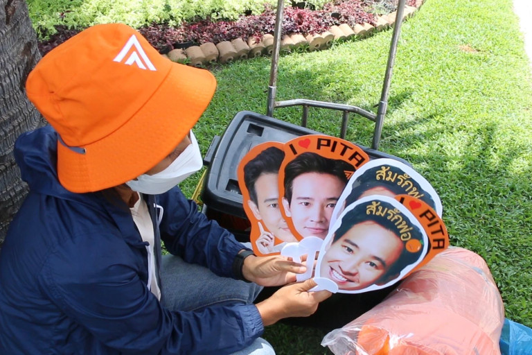 น.ส.เสาวลักษณ์ กลิ่นพิกุล อายุ 33 ปี แม่ค้าขายของที่ระลึก กล่าวว่า ที่ผ่านมาได้ติดตามพรรคก้าวไกลไปตามจังหวัดต่างๆ โดยเฉพาะจังหวัดที่ว่าที่นายกรัฐมนตรี ลงพื้นที่ หรือจุดที่พรรคก้าวไกลลงพื้นที้ก็จะตามไปขาวของที่ระลึกด้วย ซึ่งจะขายดีมากโดยเฉพาะของที่ระลึกที่มีสัญลักษณ์ของพรรค ไม่ว่าจะเป็น พัดที่มีหน้าคุณพิธาในราคาจำหน่ายชิ้นละ50 บาท ที่คาดผมชิ้นละ 100 บาท เสื้อยืด 200 บาท หมวกใบละ 100 บาท