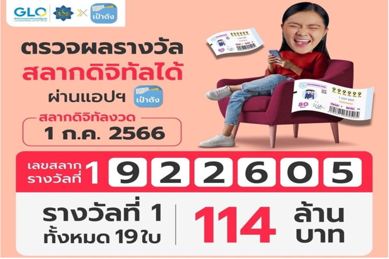 ธนาคารกรุงไทย รายงานว่า สลากกินแบ่งรัฐบาล งวดวันที่ 1 ก.ค.2566 โดยรางวัลที่ 1 เลขที่ 922605 ปรากฎว่า มีผู้ถูกรางวัลสลากดิจิทัล รวมจำนวนใบที่ถูกทั้งหมด 19 ใบ รวมเป็นเงินรางวัล 114 ล้านบาท