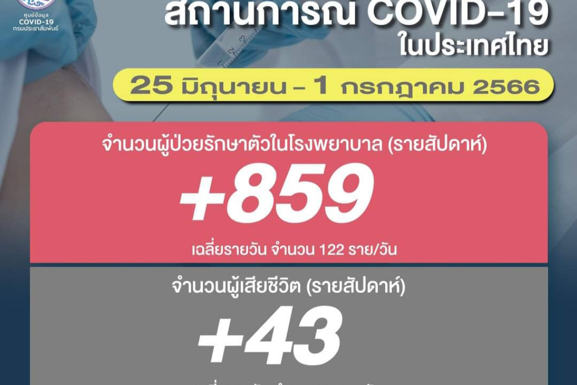 วันที่ 3 ก.ค.2566 ศูนย์ข้อมูล COVID-19 กรมประชาสัมพันธ์ รายงานสถานการณ์โรคโควิด-19 รายสัปดาห์ เกาะติดยอดผู้ติดเชื้อโควิด-19 รายสัปดาห์ ระหว่างวันที่ 25 มิถุนายน - 1 กรกฎาคม 2566 พบผู้ป่วยรักษาตัวในโรงพยาบาล (รายสัปดาห์) จำนวน 856 ราย : เฉลี่ยรายวัน จำนวน 122 ราย/วัน ผู้เสียชีวิต (รายสัปดาห์) จำนวน 43 ราย : เฉลี่ยรายวัน จำนวน 6 ราย/วัน ทั้งนี้พบยอดป่วยสะสม 28,504 ราย (ตั้งแต่ 1 มกราคม 2566)เสียชีวิตสะสม 702 ราย (ตั้งแต่ 1 มกราคม 2566)