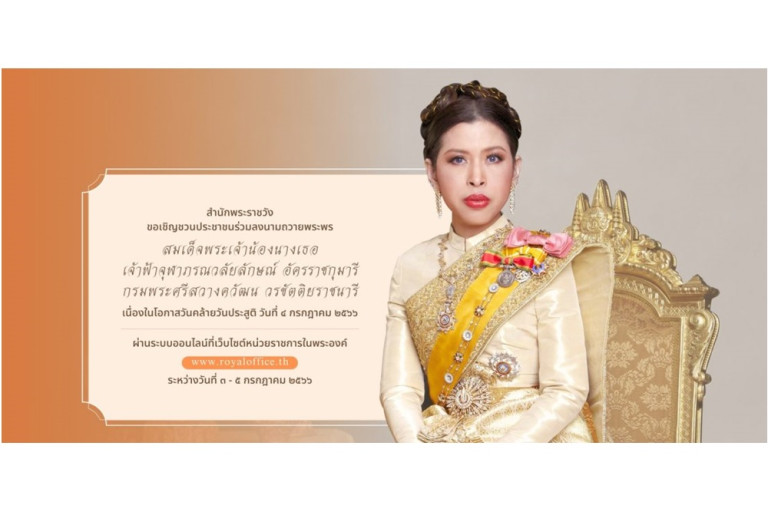 สำนักพระราชวัง ขอเชิญชวนประชาชนร่วมลงนามถวายพระพร สมเด็จพระเจ้าน้องนางเธอ เจ้าฟ้าจุฬาภรณวลัยลักษณ์ อัครราชกุมารี กรมพระศรีสวางควัฒน วรขัตติยราชนารี เนื่องในโอกาสวันคล้ายวันประสูติ วันที่ 4 กรกฎาคม 2566 ผ่านระบบออนไลน์ ที่เว็บไซต์หน่วยราชการในพระองค์ https://wellwishes.royaloffice.th ระหว่างวันที่ 3 – 5 กรกฎาคม 2566