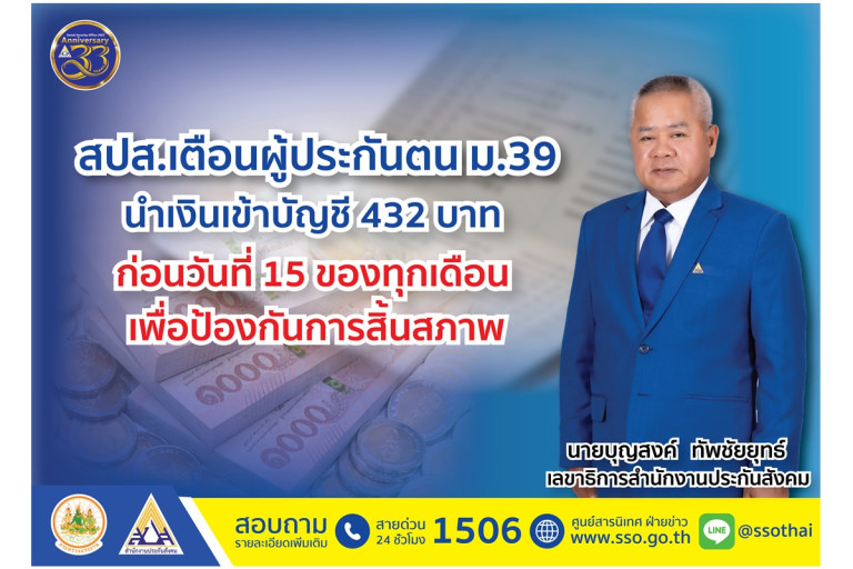 สปส.เตือนผู้ประกันตน ม.39 นำเงินเข้าบัญชี 432 บาท ก่อนวันที่ 15 ของทุกเดือน เพื่อป้องกันการสิ้นสภาพ