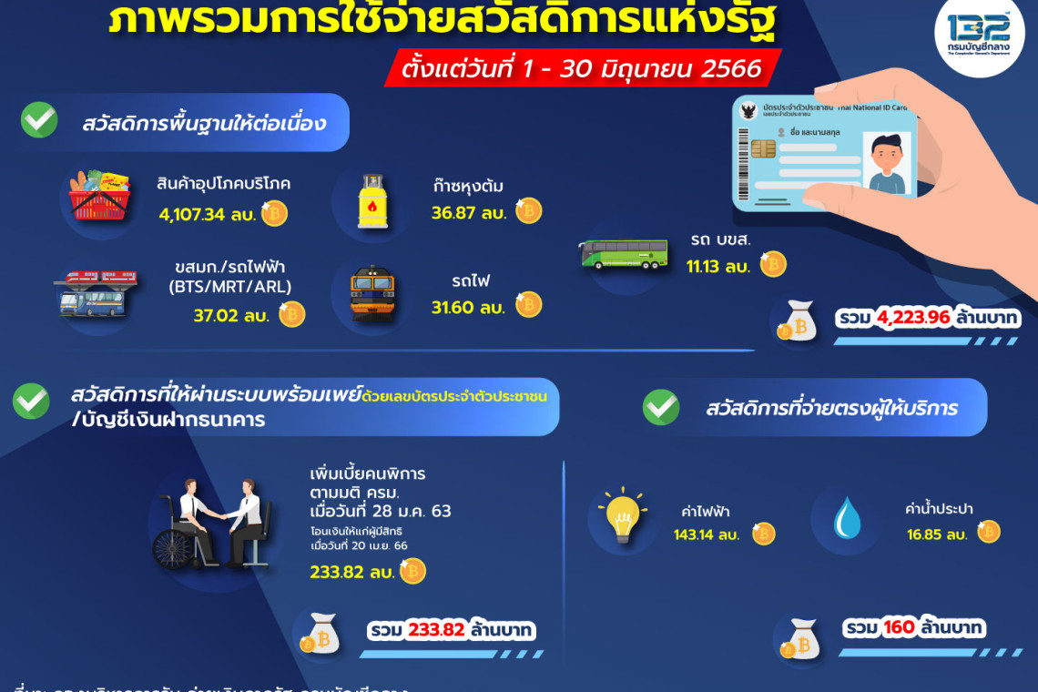 สำหรับเดือนมิถุนายน 2566 กรมบัญชีกลางขอรายงานผลการจ่ายเงินสวัสดิการแห่งรัฐ ข้อมูลตั้งแต่วันที่ 1- 30 มิถุนายน 2566 ดังนี้