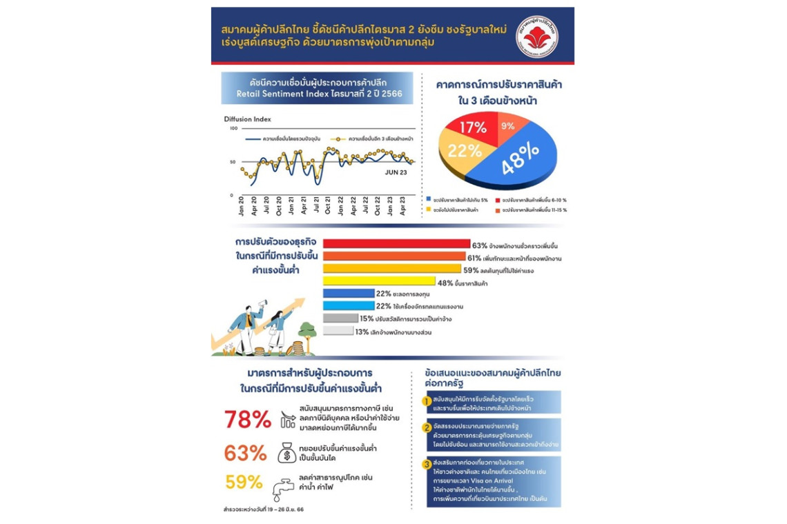 ทั้งนี้ได้เผยผลสำรวจเกี่ยวกับการฟื้นตัวของธุรกิจค้าปลีกของผู้ประกอบการ โดยสำรวจระหว่างวันที่ 19 - 26 มิถุนายน 2566 ในประเด็นต่างๆ ดังนี้