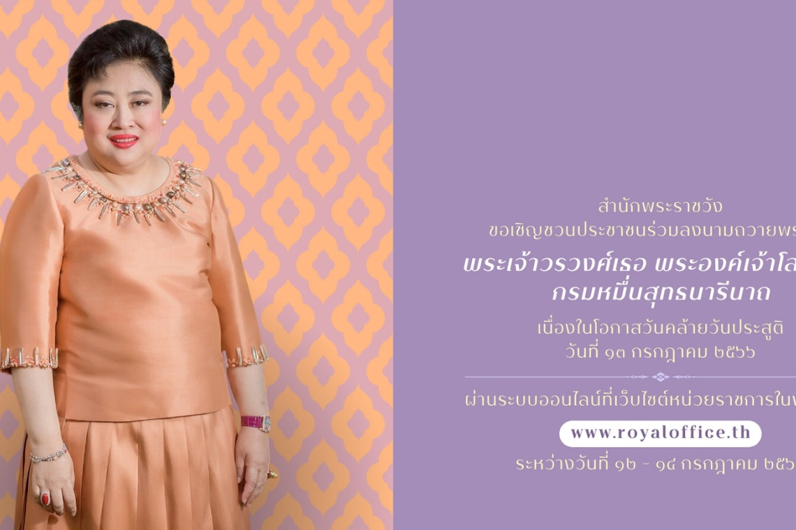 สำนักพระราชวัง ขอเชิญชวนประชาชนร่วมลงนามถวายพระพร พระเจ้าวรวงศ์เธอ พระองค์เจ้าโสมสวลี กรมหมื่นสุทธนารีนาถ เนื่องในโอกาสวันคล้ายวันประสูติ วันที่ ๑๓ กรกฎาคม ๒๕๖๖ ผ่านระบบออนไลน์ ที่เว็บไซต์หน่วยราชการในพระองค์ ระหว่างวันที่ ๑๒ – ๑๔ กรกฎาคม ๒๕๖๖