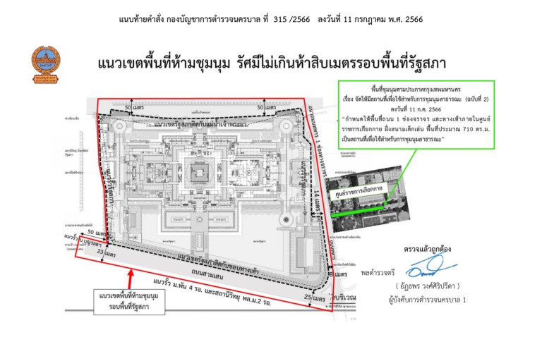 เมื่อเวลา 20.30 น. วันที่ 11 ก.ค. พล.ต.ท.ธิติ แสงสว่าง ผบช.น. พร้อมด้วย พล.ต.ต.โชคชัย งามวงศ์ รองผบช.น. ดูแลงานมั่นคง ลงนามคำสั่ง คำสั่งกองบัญชาการตำรวจนครบาล ที่ 315/2566 เรื่อง ประกาศห้ามชุมนุมสาธารณะในรัศมีไม่เกินห้าสิบเมตร รอบรัฐสภา ตามมาตรา 7 วรรคท้าย แห่งพระราชบัญญัติการชุมนุมสาธารณะ พ.ศ.2558 ตามที่กองบังคับการตำรวจนครบาล 1 มีหนังสือ ด่วนที่สุด ที่ 0015.(บก.น.1) 15 / 6302 ลงวันที่ 10 กรกฎาคม 2566 ขอให้ออกประกาศห้ามการชุมนุมรอบรัฐสภาในรัศมีไม่เกิน 50 เมตร