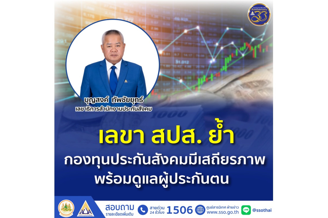 “สำนักงานประกันสังคม ขอให้พี่น้องผู้ประกันตนทุกท่านมั่นใจได้ว่ากองทุนประกันสังคมเป็นกองทุนที่มีเสถียรภาพ มั่นคง สามารถสร้างผลตอบแทนได้อย่างต่อเนื่องและเพียงพอ สำหรับการจ่ายสิทธิประโยชน์ในระยะยาวให้กับผู้ประกันตนทุกกรณีอย่างแน่นอน ทั้งนี้ ผู้ประกันตนสามารถค้นหาข้อมูลการลงทุนและสถานะกองทุนประกันสังคมเพิ่มเติมได้ทางเว็บไซต์ของสำนักงานประกันสังคม www.sso.go.th นายบุญสงค์ กล่าวท้ายสุด