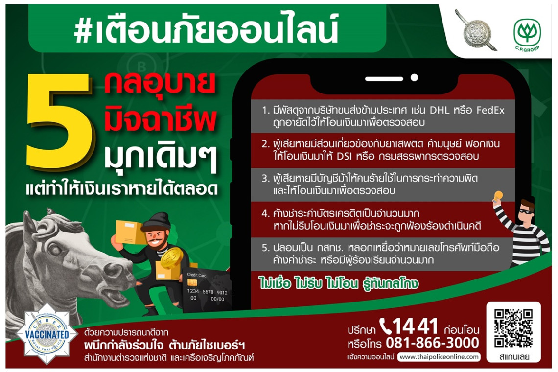 สำนักงานตำรวจแห่งชาติและเครือซีพี เปิด 5 กลอุบายมุกคอลเซนเตอร์ โจรไซเบอร์ใช้หลอกประจำ ย้ำต้องมีสติทุกขณะ พร้อมจับมือสานต่อโครงการ "ผนึกกำลังร่วมใจ ต้านภัยไซเบอร์ ไม่เชื่อ ไม่รีบ ไม่โอน รู้ทันกลโกง" ต่อเนื่อง