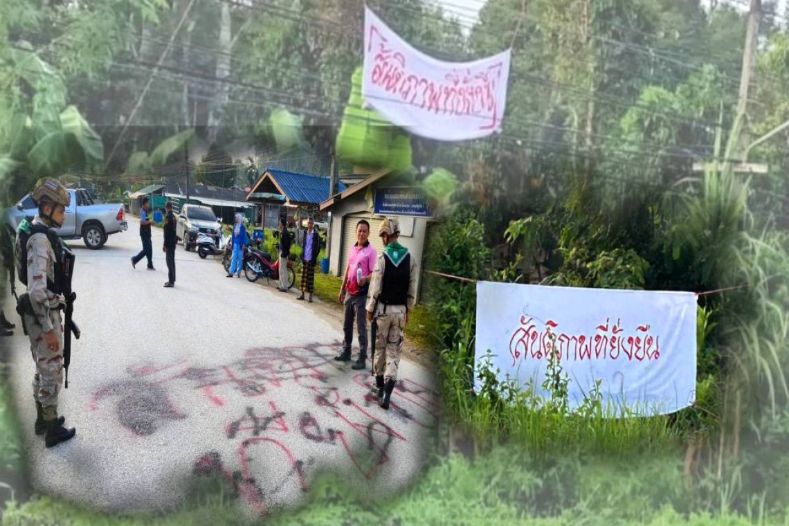 วันที่ 13 ก.ค.66 เมื่อเวลา 06.00 น. เจ้าหน้าที่ตำรวจ สภ.ธารโต จังหวัดยะลา รับแจ้งจาก ชุด รักษาความปลอดภัยประจำหมู่บ้าน (ชรบ.)ว่า มีคนร้ายก่อกวนพ่นสีบนถนนและแขวนป้ายผ้า จำนวน 3 จุด โดยจุดที่ 1.คนร้ายได้มีการพ่นสีแดง บนถนน โดยการเขียนข้อความว่า “สันติภาพที่ยั่งยืน” บริเวณถนนสายบ้านผ่านศึก-บ้านดินเสมอ ใกล้กับ มัสยิด บ้านผ่านศึก หมู่ที่ 2 ต.คีรีเขต อ.ธารโต จุดที่ 2.คนร้ายได้มีการแขวป้ายผ้าริมถนนและวางวัตถุต้องสงสัย บริเวณถนนสายธารโต-เบตง บ้านบูโล๊ะสนีแย หมู่ที่ 4 ต.บ้านแหร อ.ธารโต และจุดที่ 3.คนร้ายยังได้แขวป้ายผ้าริมถนน บริเวณถนนสายบันนังสตา-ธารโต บ้านธารโต หมู่ที่ 1 ต.ธารโต อ.ธารโต