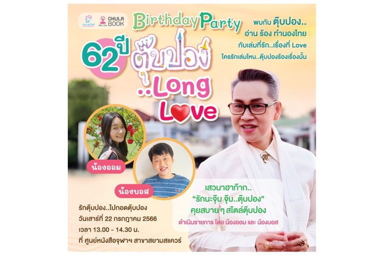 ศูนย์หนังสือจุฬาลงกรณ์มหาวิทยาลัย ร่วมกับ มูลนิธิหนังสือเพื่อเด็ก และสำนักพิมพ์แปลน ฟอร์ คิดส์ ขอเชิญพ่อแม่ ผู้ปกครอง พาคุณหนูๆ มาร่วมงาน “Birthday Party 62 ปีตุ๊บปอง.. Long Love” ในวันเสาร์ที่ 22 กรกฎาคม 2566 เวลา 13.00 - 14.30 น. ณ ศูนย์หนังสือจุฬาฯ สาขาสยามสแควร์