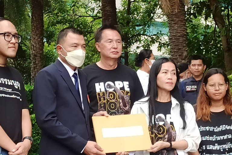 วันที่ 18 ก.ค.66 เมื่อเวลา 11.00น.ที่หน้าศาลรัฐธรรมนูญ ศูนย์ราชการฯ แจ้งวัฒนะ กลุ่ม 24 มิถุนาประชาธิปไตยและคณะรณรงค์รัฐธรรมนูญประชาชน (ครช.) ประมาณ 20 คน นำโดยนายสมยศ พฤกษาเกษมสุข ชุมนุมหน้าศาลรัฐธรรมนูญ เพื่อคัดค้านศาลรัฐธรรมนูญวินิจฉัยยุบพรรคก้าวไกล ตามที่สำนักงานคณะกรรมการการเลือกตั้ง (กกต.) ยื่นคำร้องต่อศาลรัฐธรรมนูญ ขอให้ สมาชิกภาพส.ส.ของนายพิธา ลิ้มเจริญรัตน์ ส.ส.บัญชีรายชื่อ หัวหน้าพรรคและแคนดิเดตนายกรัฐมนตรี พรรคก้าวไกลสิ้นสุดลงตามมาตรา 82 และ รับคำร้องกรณีพรรคก้าวไกลแก้ไขมาตรา 112 เป็นการล้มล้างการปกครองอันจะมีผลต่อการยุบพรรคก้าวไกล