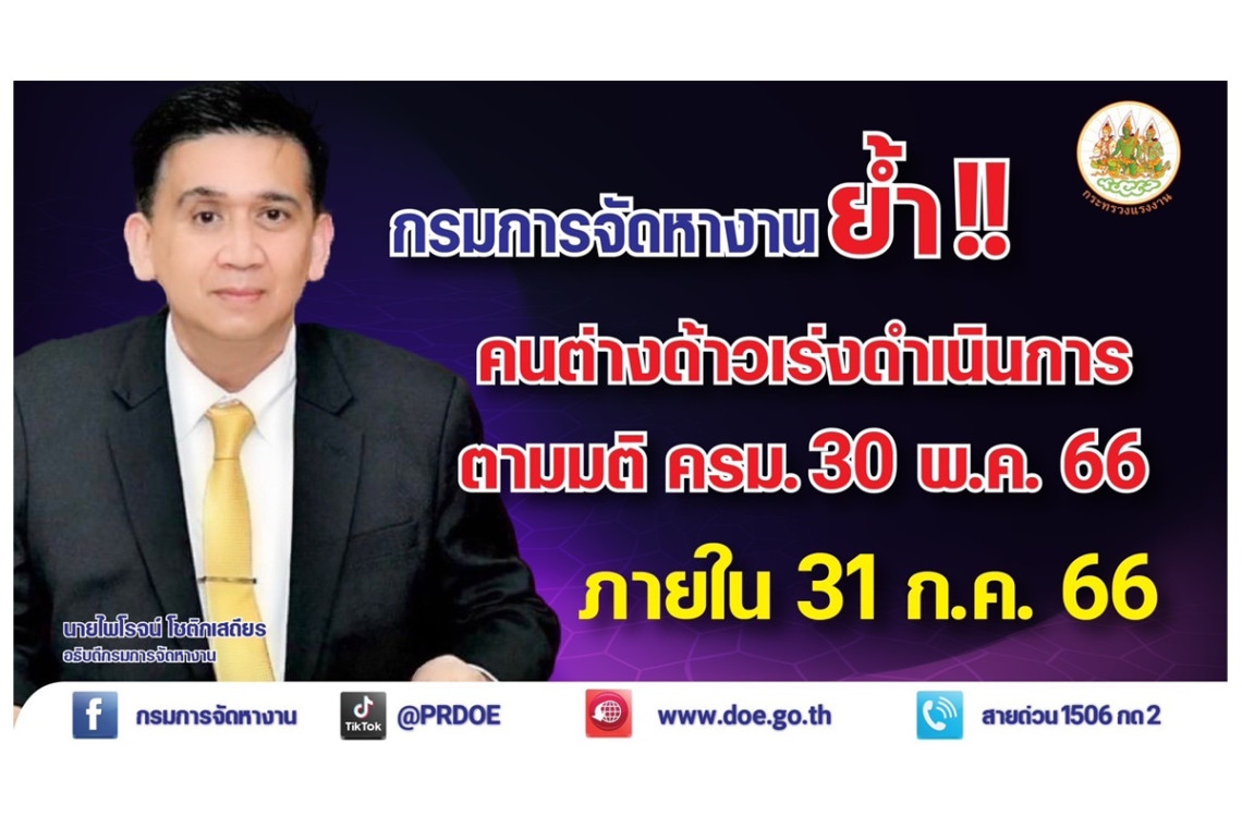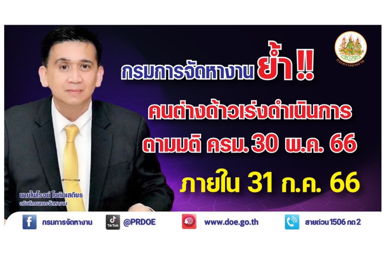 กรมการจัดหางานเน้นย้ำให้คนต่างด้าวที่ยังยื่นเอกสารหลักฐานการอนุญาตให้อยู่ในราชอาณาจักรยังไม่ครบถ้วนเร่งดำเนินการให้แล้วเสร็จภายใน 31 กรกฎาคม 2566 มิเช่นนั้นจะไม่สามารถอยู่ต่อและทำงานภายในราชอาณาจักรต่อไปได้อีก