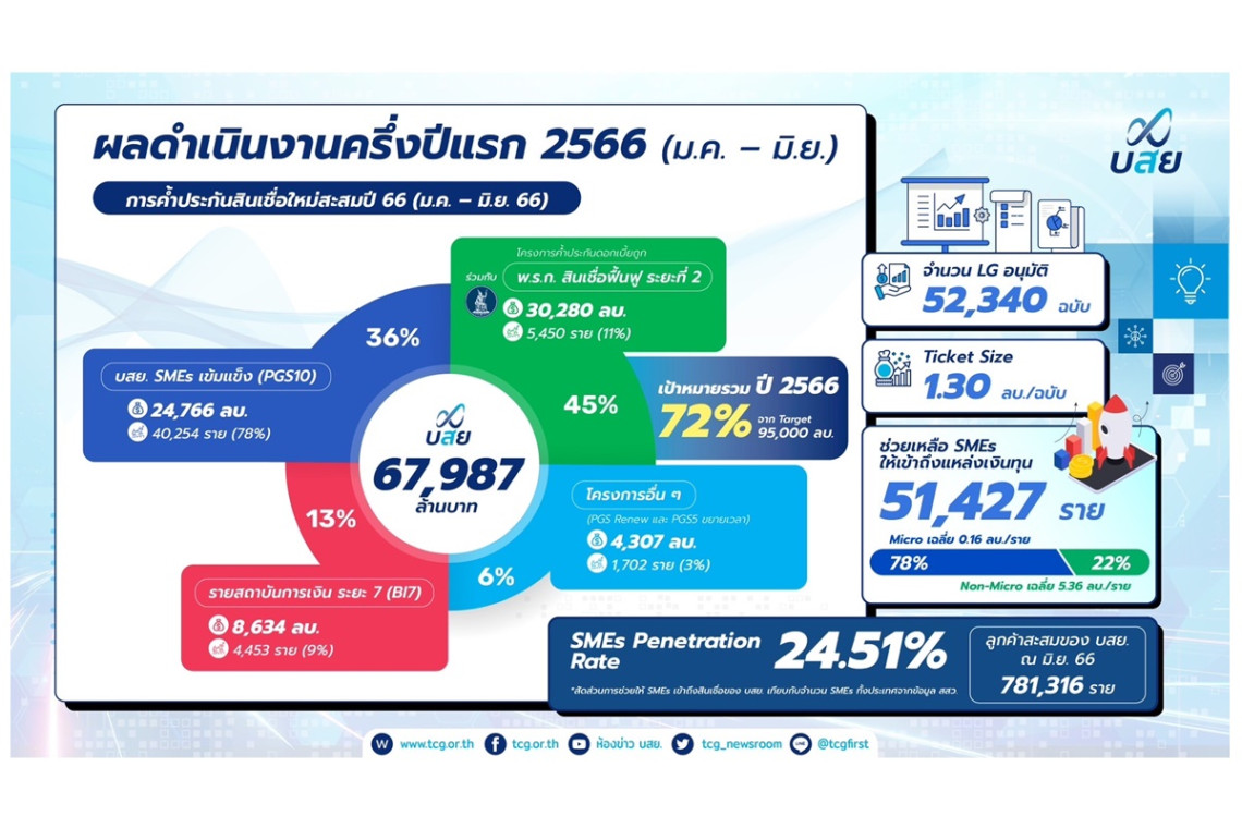 นายสิทธิกร ดิเรกสุนทร กรรมการและผู้จัดการทั่วไป บรรษัทประกันสินเชื่ออุตสาหกรรมขนาดย่อม (บสย.) เปิดเผยผลดำเนินงาน บสย. 6 เดือนแรกของปี 2566 ระหว่างเดือน มกราคม – มิถุนายน ประสบผลสำเร็จตามเป้าทั้งด้านค้ำประกันสินเชื่อ เติมสภาพคล่องทางการเงินต่อยอดธุรกิจ SMEs การแก้หนี้ ปรับปรุงโครงสร้างหนี้ ผ่านมาตรการ “บสย. พร้อมช่วย” การให้คำปรึกษาทางการเงิน SMEs (บสย. F.A.Center) การขับเคลื่อนองค์กรด้วยดิจิทัล Digital Technology และการเพิ่มจำนวนผู้ใช้งานบน Line @tcgfirst