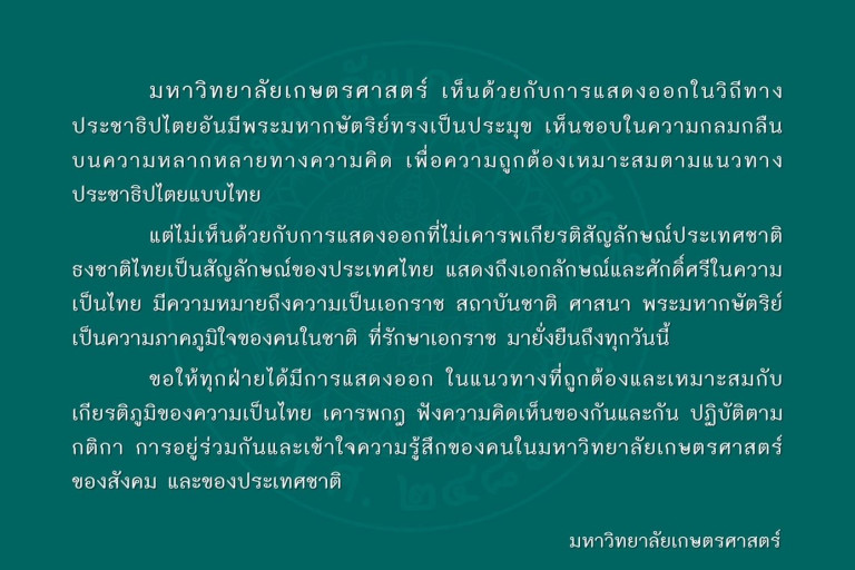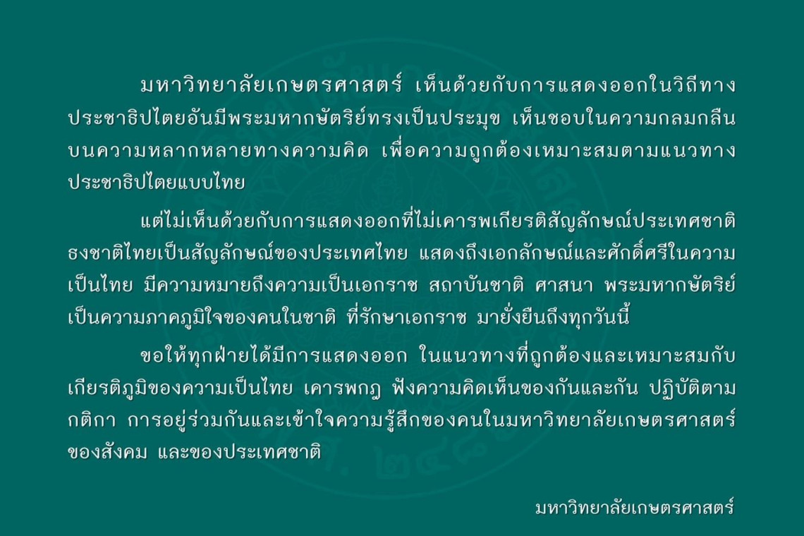 “มหาวิทยาลัยเกษตรศาสตร์เห็นด้วยกับการแสดงออกในวิถีทางประชาธิปไตยอันมีพระมหากษัตริย์ทรงเป็นประมุข เห็นชอบในความกลมกลืนบนความหลากหลายทางความคิด เพื่อความถูกต้องเหมาะสมตามแนวทางประชาธิปไตยแบบไทย
