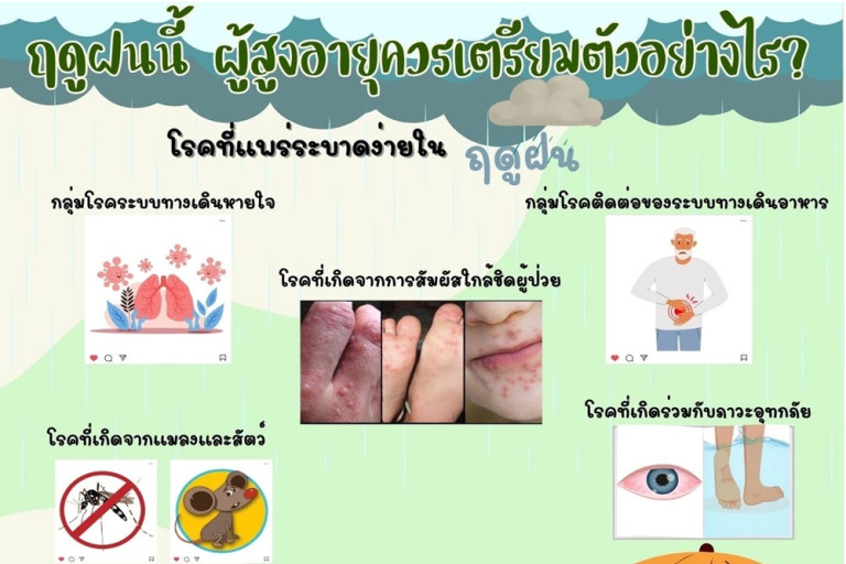 ในช่วงฤดูฝนที่สภาพอากาศมีการเปลี่ยนแปลงบ่อย รวมถึงอุณหภูมิที่แปรปรวน อาจะเป็นสาเหตุที่ทำให้เกิดโรคต่างๆ โดยเฉพาะผู้สูงอายุเป็นวัยที่ต้องดูแลสุขภาพพิเศษ ดังนั้น การเตรียมตัวทั้งสุขภาพกายและสุขภาพใจเป็นวิธีการป้องกันที่ควรให้ความสำคัญและไม่ควรละเลย