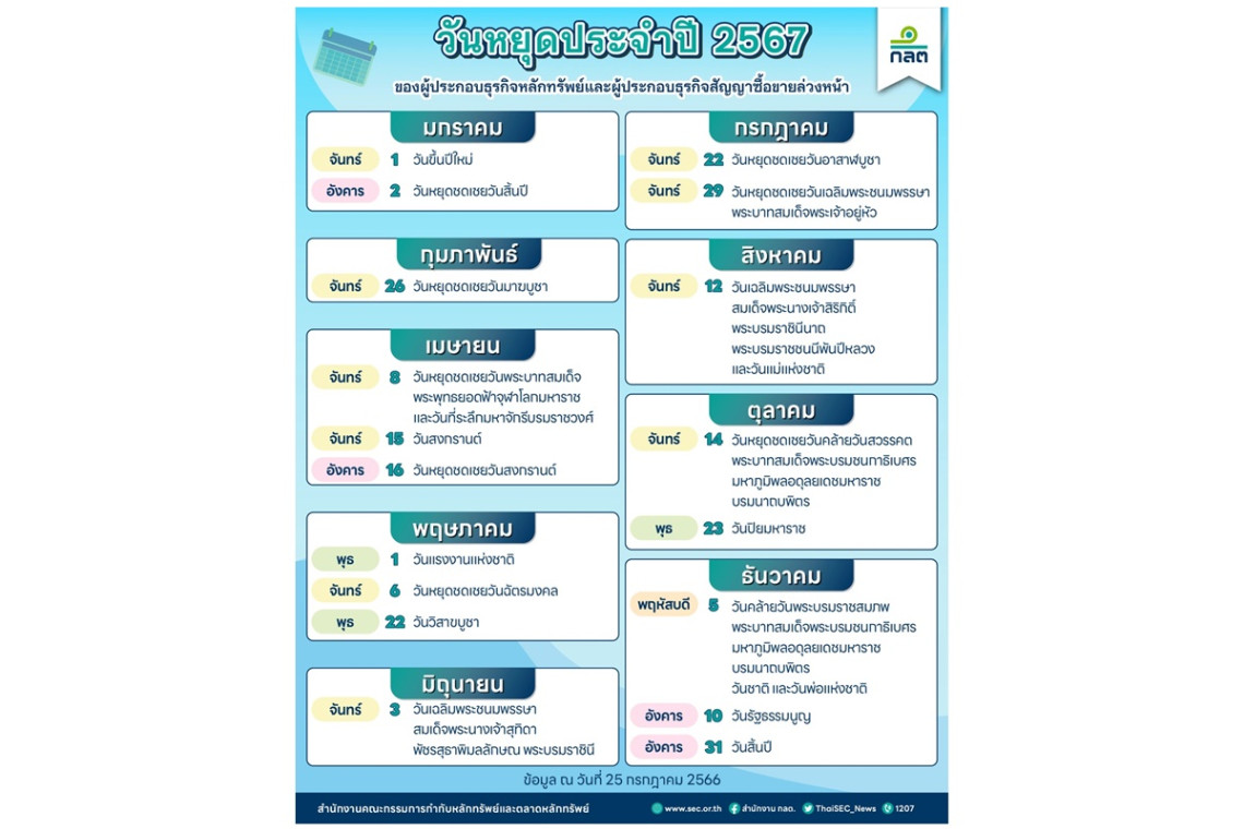 สำนักงานคณะกรรมการกำกับหลักทรัพย์และตลาดหลักทรัพย์ (ก.ล.ต.) ออกประกาศกำหนดวันหยุดทำการของผู้ประกอบธุรกิจหลักทรัพย์และผู้ประกอบธุรกิจสัญญาซื้อขายล่วงหน้า ประจำปี พ.ศ.2567 ดังต่อไปนี้