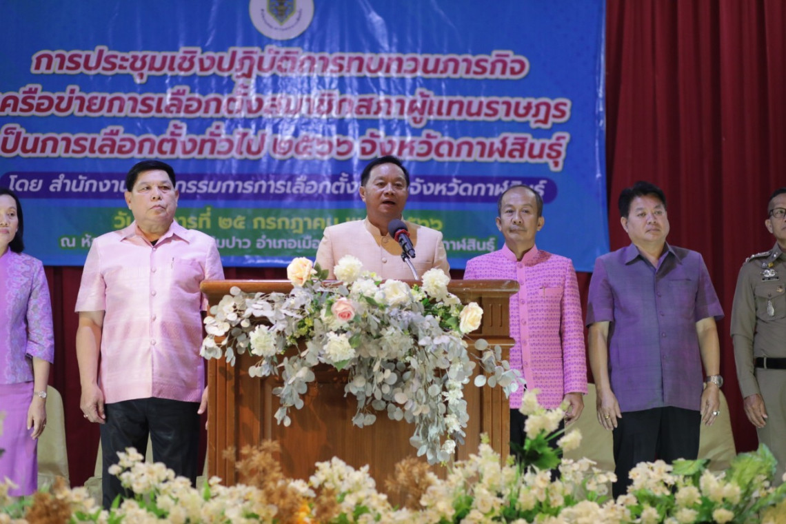 วันที่ 25 กรกฎาคม 2566 ผู้สื่อข่าวรายงาน ว่า ที่ห้องประชุมโรงแรมริมปาว อ.เมือง จ.กาฬสินธุ์ นายศุภศิษย์ กอเจริญยศ ผู้ว่าราชการ จ.กาฬสินธุ์ เป็นประธานเปิดการประชุมเชิงปฏิบัติการ ทบทวนภารกิจเครือข่ายการเลือกตั้ง สมาชิกสภาผู้แทนราษฎร เมื่อวันที่ 14 พฤษภาคมที่ผ่านมา โดยมีนายสำเริง ม่วงสังข์ รองผู้ว่าราชการ จ.กาฬสินธุ์ นายธนภัทร ณ ระนอง ปลัด จ.กาฬสินธุ์ พล.ต.ต.มนตรี จรัลพงศ์ ที่ปรึกษาผู้ว่าราชการ จ.กาฬสินธุ์ นายสุรพงษ์ ทิพย์โอสถ ผอ.สำนักงานคณะกรรมการการเลือกตั้งประจำ จ.กาฬสินธุ์ และหัวหน้าส่วนราชการร่วมกิจกรรม พร้อมเครือข่ายช่วยเหลือปฏิบัติงานการเลือกตั้ง , คณะกรรมการการเลือกตั้งประจำเขตเลือกตั้ง , ผู้อำนวยการการเลือกตั้งประจำเขตเลือกตั้ง , วิทยากรการเลือกตั้ง , สื่อมวลชน , คณะกรรมการศูนย์ส่งเสริมพัฒนาประชาธิปไตย , ผู้ประสานงานเครือข่ายในระดับอำเภอ , นายทะเบียนอำเภอ และภาคีเครือข่าย รวม 109 คน เข้าประชุม