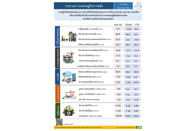 เศรษฐกิจไทยในเดือนมิ.ย.66 ได้รับปัจจัยสนับสนุนจากการบริโภคภาคเอกชน และภาคการท่องเที่ยวที่ขยายตัวได้ต่อเนื่องทั้งจากนักท่องเที่ยวต่างประเทศและผู้เยี่ยมเยือนชาวไทย ขณะที่อัตราเงินเฟ้อปรับตัวลดลงต่อเนื่อง