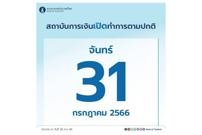 ธนาคารแห่งประเทศไทย (ธปท.) แจ้งว่า ตามที่คณะรัฐมนตรี (ครม.) อนุมัติให้วันจันทร์ที่ 31 กรกฎาคม 2566 เป็นวันหยุดราชการเพิ่มเป็นกรณีพิเศษ อีก 1 วัน เพื่อให้มีวันหยุดต่อเนื่องกัน ซึ่งจะเป็นการกระตุ้นการเดินทางและส่งผลดีต่อการท่องเที่ยว โดยให้ธนาคารแห่งประเทศไทย พิจารณาความเหมาะสมของการกำหนดวันหยุดสำหรับสถาบันการเงิน และสถาบันการเงินเฉพาะกิจ นั้น ธปท.พิจารณาแล้ว เห็นควรกำหนดให้วันดังกล่าวเป็นวันทำการปกติของสถาบันการเงิน และสถาบันการเงินเฉพาะกิจ เพื่อไม่ให้ส่งผลกระทบต่อกิจกรรมทางเศรษฐกิจ เนื่องจากสถาบันการเงิน และสถาบันการเงินเฉพาะกิจ ถือเป็นตัวกลางสำคัญในการให้บริการทางการเงินแก่ภาคธุรกิจและประชาชน