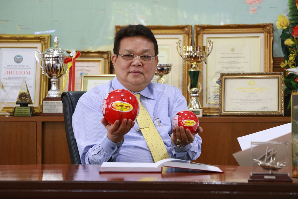 สำหรับบริษัท อิไลด์ ไฟร์บอล โปรจำกัด จำกัด เป็นผู้ผลิตและจัดจำหน่าย ภายใต้เครื่องหมายการค้า ELIDE FIRE extinguishing ball และเจ้าของลิขสิทธิ์การใช้งาน ได้รับการยอมรับและรับรางวัลมากมายทั้งในและต่างประเทศ เช่น เหรียญทองเกียรตินิยม (Gold Medal with Mention) จากองค์กรยูเรก้า EUREKA กรุงบรัสเซลส์ ราชอาณาจักรเบลเยี่ยม ปี 2001 รางวัล New Millennium Award ที่กรุงเบอร์ลิน ประเทศเยอรมันนี 2003 รางวัล WIPO สำหรับนักประดิษฐ์ยอดเยี่ยมจากองค์กรทรัพย์สินทางปัญญาโลกในงานวันนักประดิษฐ์ครั้งที่ 1 (1st IIDC) กรุงเทพฯ ปี 2008 ได้รับชนะเลิศเหรียญทองรางวัลการประดิษฐ์ผลกระทบสูง, จากสภาวิจัยแห่งชาติประเทศไทย ในงานวันนักประดิษฐ์ครั้งที่ 2 (2nd IIDC) กรุงเทพฯ ปี 2009 อันดับ 1 ใน 100 นวัตกรรมยอดเยี่ยมของปี 2016 Top 100 awesome products for first half 2016 เป็นต้น โดยได้มีการพัฒนาและทำการทดสอบผ่าน มอก.3413-2565 และมีความสามารถ ดับเพลิงอัตโนมัติ ตามประเภทของไฟเป็น Classification of Fire ตามความสามารถของแต่ละรุ่น ได้แก่ TECHIDEAS ขนาด (6 In) ทดสอบมาตรฐาน ประเภทของไฟ Class 2-A Class 5-B Class 1-C (Class 2-F เพลิงไหม้ที่เพลิงอยู่ในช่วงขยายอย่างรวดเร็วและให้อุณหภูมิสูงสุด) Loving Care ขนาด (4 In) ทดสอบมาตรฐาน ประเภทของไฟ Class 1-A Class 2-B Class 1-C (Class 1-F เพลิงไหม้ที่เพลิงอยู่ในช่วงขยายอย่างรวดเร็วและให้อุณหภูมิสูงสุด) สามารถผลิตและจัดจำหน่ายได้แล้วปัจจุบัน