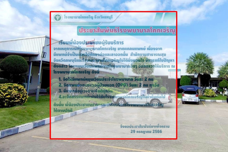จากกรณีที่ โรงพยาบาลโคกเจริญ จ.ลพบุรี โพสต์ประกาศว่าตั้งแต่เดือนสิงหาคม 2566 โรงพยาบาลโคกเจริญมีแพทย์ลดลงเหลือเพียง 1 ท่าน ไม่เพียงพอต่อการปฏิบัติงาน การบริการที่ต้องพบแพทย์อาจล่าช้าไปบ้าง กรณีอุบัติเหตุฉุกเฉิน หากท่านสะดวก สามารถรับการรักษาที่โรงพยาบาลข้างเคียงได้ทุกแห่ง (UCEP) "โรงพยาบาลจะพยายามอย่างเต็มที่ เต็มกำลัง เพื่อดูแลพี่น้องประชาชนโคกเจริญ"