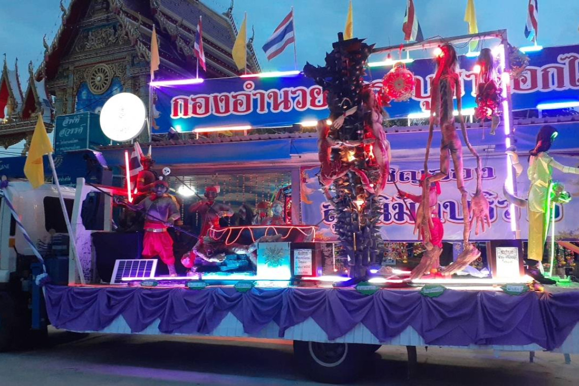 ทาง "วัดม่วง" ยังทำขบวนต้นเทียนเรียบง่าย พร้อมขบวนนรก เปรต กระทะทองแดง ขบวนมีดมหามงคลยักษ์ฯลฯ และมาพร้อมไอเดียสร้าง ยาน UFO และมนุษย์ต่างดาว ร่วมขบวนแห่เทียนอีกด้วย เตรียมไปชมได้วันที่ 1-4 สิงหาคม บริเวณลานย่าโม โคราช