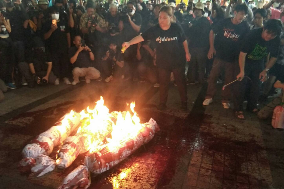 ผู้สื่อข่าวรายงานว่าภายหลังจากที่กลุ่มมวลชนทราบว่า พรรคเพื่อไทยได้ถีบพรรคก้าวไกลออกจากการจัดตั้งรัฐบาล ทำให้กลุ่มด้อมส้มไม่พอใจ นำหุ่นฟางมาวางไว้บริเวณหน้าพรรคเพื่อไทยก่อนจะราดน้ำมันจุดไฟเผา ทำให้เกิดความโกลาหลวุ่นวาย และกลุ่มมวลชนส่วนหนึ่งพยายามที่จะบุกเข้าไปภายในอาคาร