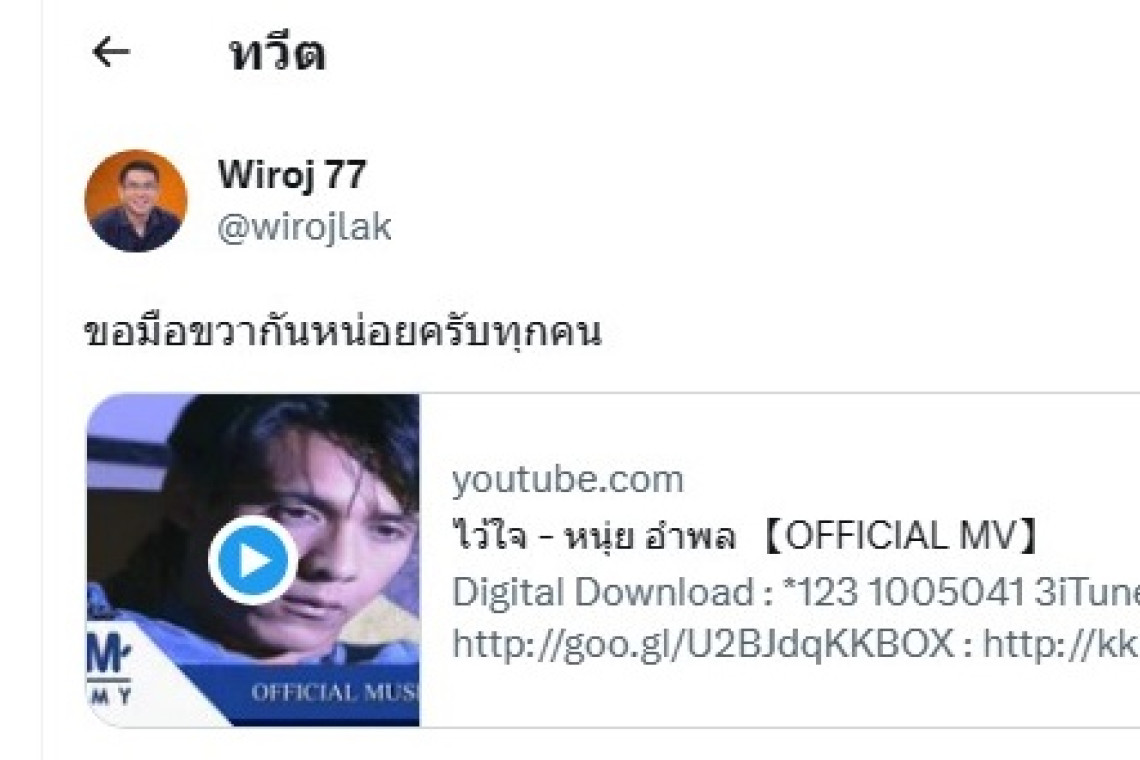 เมื่อวันที่ 2ส.ค.66 นายวิโรจน์ ลักขณาอดิศร ส.ส.บัญชีรายชื่อพรรคก้าวไกล โพสต์ทวิตเตอร์ "Wiroj 77" เป็น MV เพลง ไว้ใจ ของ หนุ่ย อำพล ลำพูน พร้อมระบุข้อความว่า "ขอมือขวากันหน่อยครับทุกคน"