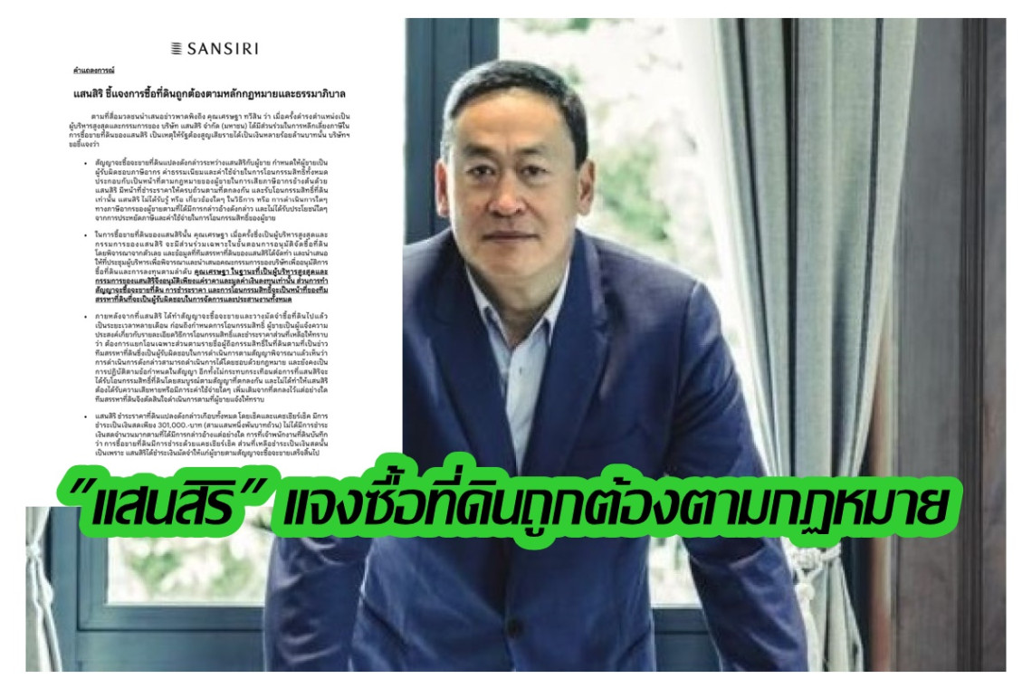 ตามที่สื่อมวลชนนำเสนอข่าวพาดพิงถึง เศรษฐา ทวีสิน ว่า เมื่อครั้งดำรงตำแหน่งเป็นผู้บริหารสูงสุดและกรรมการของ บริษัท แสนสิริ จำกัด (มหาชน) ได้มีส่วนร่วมในการหลีกเลี่ยงภาษีในการซื้อขายที่ดินของแสนสิริ เป็นเหตุให้รัฐต้องสูญเสียรายได้เป็นเงินหลายร้อยล้านบาทนั้น บริษัทฯ ขอชี้แจงว่า