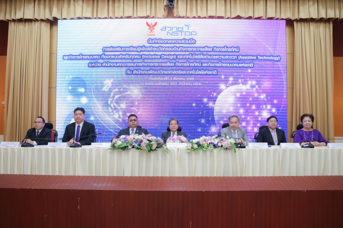 วันนี้ (วันที่ 3 สิงหาคม 2566) สำนักงานคณะกรรมการกิจการกระจายเสียง กิจการโทรทัศน์ และกิจการโทรคมนาคมแห่งชาติ (กสทช.) ร่วมกับสำนักงานพัฒนาวิทยาศาสตร์และเทคโนโลยีแห่งชาติ (สวทช.) ลงนามในบันทึกข้อตกลงความร่วมมือการส่งเสริมการเรียนรู้เพื่อสร้างนวัตกรรมด้านกิจการกระจายเสียง กิจการโทรทัศน์ และกิจการโทรคมนาคมที่ออกแบบสำหรับทุกคน (Inclusive Design) และเทคโนโลยีสิ่งอำนวยความสะดวก (Assistive Technology)