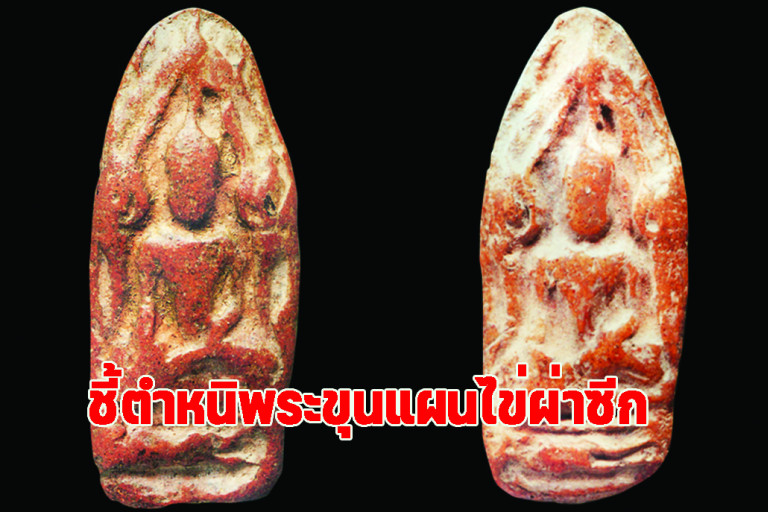 - มีทั้งเนื้อหยาบและเนื้อละเอียด หน้าตาไม่ชัดนัก แต่จะเห็นเม็ดแร่สีน้ำตาลอมแดงกระจายอยู่ทั่วองค์ เนื้อแม้จะดูคล้ายพระขุนแผนพิมพ์อื่นๆ แต่มีความแน่นตัวมากกว่า เมื่อใช้ถูกเหงื่อจะขึ้นมันเงางาม