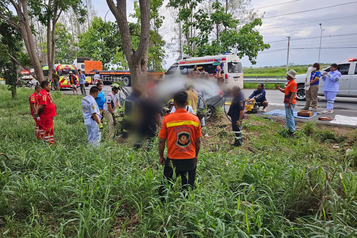 อุบัติเหตุสลด! รถเก๋งเสียหลักพุ่งชนต้นไม้ ไฟลุกท่วมห้องเครื่อง เสียชีวิตติดคารถ 2 ราย ตรวจประวัติรถ พบเจ้าของเป็นนายทหาร ยศนาวาอากาศโท
