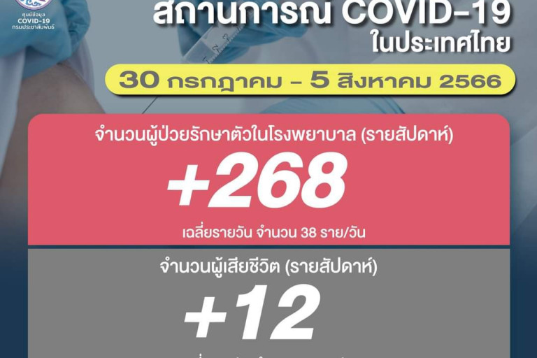 วันที่ 7 ส.ค.2566 ศูนย์ข้อมูล COVID-19 กรมประชาสัมพันธ์ รายงานสถานการณ์โรคโควิด-19 รายสัปดาห์ เกาะติดยอดผู้ติดเชื้อโควิด-19 รายสัปดาห์ ระหว่างวันที่ 30 กรกฎาคม - 5 สิงหาคม 2566 พบผู้ป่วยรักษาตัวในโรงพยาบาล (รายสัปดาห์) จำนวน 268 ราย : เฉลี่ยรายวัน จำนวน 38 ราย/วัน ผู้เสียชีวิต (รายสัปดาห์) จำนวน 12 ราย : เฉลี่ยรายวัน จำนวน 2 ราย/วัน ทั้งนี้พบยอดป่วยสะสม 31,523 ราย (ตั้งแต่ 1 มกราคม 2566)เสียชีวิตสะสม 768 ราย (ตั้งแต่ 1 มกราคม 2566)