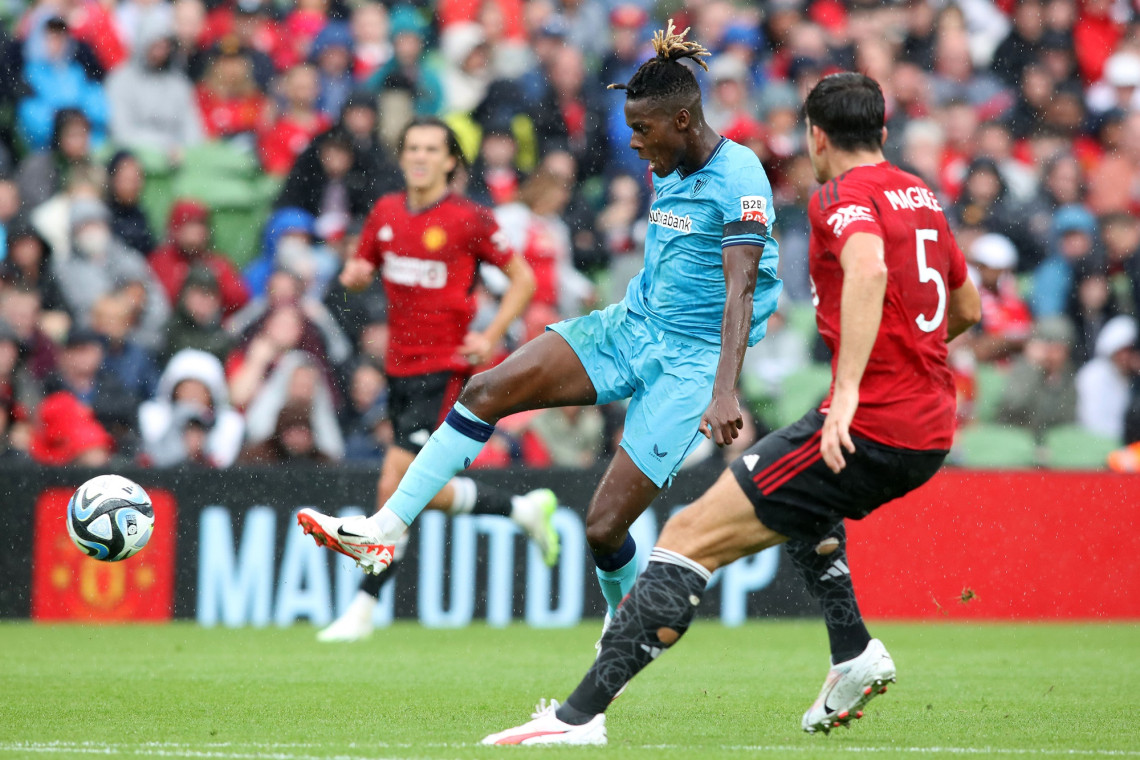 ที่สนาม อาวิว่า สเตเดี้ยม เมืองดับลิน ในการแข่งขันฟุตบอลกระชับมิตรปรีซีซั่น คืนวันที่ 6 ส.ค.66 ระหว่างทีม "แมนเชสเตอร์ ยูไนเต็ด" พบกับทีม "แอธเลติก บิลเบา" เริ่มเกมการแข่งขัน นาทีที่ 29 บิลเบา ได้ประตูขึ้นนำ 1-0 จากความผิดพลาดของ แม็คไกวร์ ตัดสินใจไม่ดี ทำเสียบอลหน้าประตู โดนบิลเบาสวนกลับจ่ายบอลทะลุช่องให้ วิลเลียมส์ ยิงเข้าไป