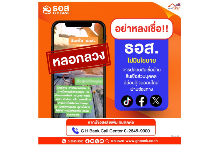 ธอส.เตือนภัยกลุ่มมิจฉาชีพแอบอ้างชื่อ-โลโก้ธนาคารหลอกลวงประชาชน ยืนยันไม่มีส่วนเกี่ยวข้อง ขอทุกคนอย่าหลงเชื่อ